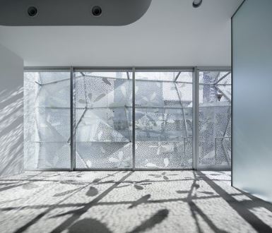 カーテンウォールがお花の影が貸室内にも映り込むときがあり、独創的な空間を演出します。夜のライトアップも印象的ですよ!